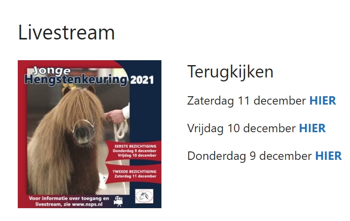 - Op vrijdag 7 januari worden de nog te tonen hengsten verwacht van de jaargang goedgekeurd in 2018 én de volledige jaargang van 2019. In de middag is er dan ruimte voor de nakeuring, geplande start 13.30 uur en vervolgens de herkeuring om 15.00 uur.