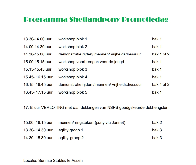 Zaterdag 14 mei organiseren de 5 noordelijke fokverenigingen van het N.S.P.S. de Shetlandpony promotiedag Noord
